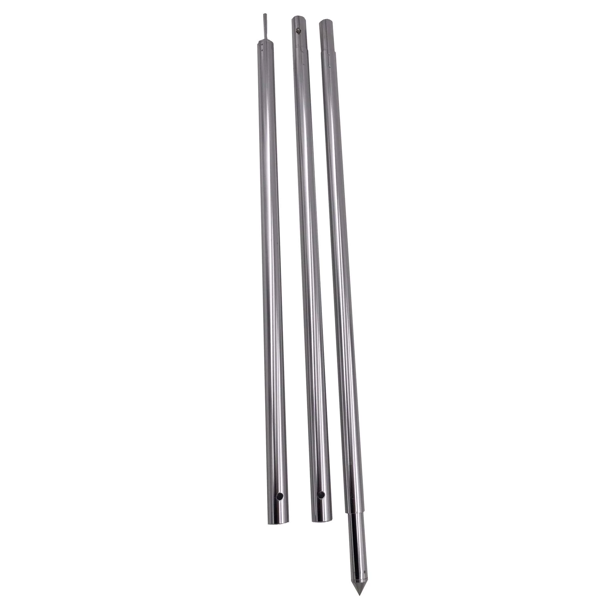 Die einzelnen Stangen besitzen eine Länge von 68 cm und werden mittels Druckklipsen verbunden. Anschließend kannst du die Höhe durch die Drehfixierung der Bodenspitze anpassen. Um in der Höhe noch variabler zu bleiben, kannst du eines oder gleich beide Mittelteile weglassen und nur das Unterteil mit dem Oberteil verbiniden. Der Durchmesser der Stangen von 22/19 mm erlaubt einen universellen Einsatz.