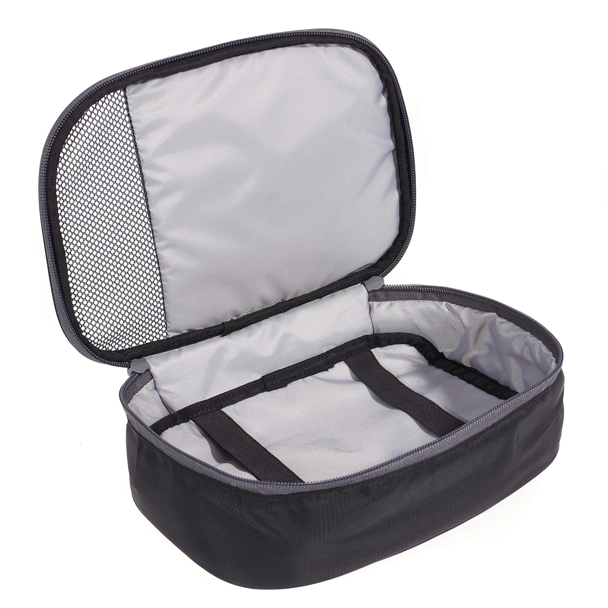 Der leichtgewichtige Packbeutel ist rundum gepolstert und hat ein kleines Sichtfenster aus Mesh. Er lässt sich mittels umlaufendem 2-Wege-Reißverschluss wie ein Buch aufklappen. Eine hochklappbare Trennwand mit 2 Gummibänder ermöglicht es dir, den Inhalt bei Bedarf zu sortieren und fixieren.