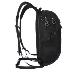 Das belüftete Tragesystem sorgt dafür, dass du bei Anstrengung und auf heißen Etappen nicht so schnell überhitzt und die integrierte Regenhülle schützt bei Niederschlägen. Da es gerade auf langen Touren vorteilhaft ist, dass du an deine wichtigsten Ausrüstungsgegenstände ohne Umstände herankommst, hat der Tourenrucksack zwei großzügig geschnittene RV-Fächer auf dem Hüftgurt. Auch die seitlichen Steckfächer sind nicht klein, so passen auf trockenen Abschnitten mehrere Wasserflaschen hinein. Die Seitenfächer kannst du übrigens auch beim Laufen erreichen, dadurch musst du nicht anhalten, um zu trinken.