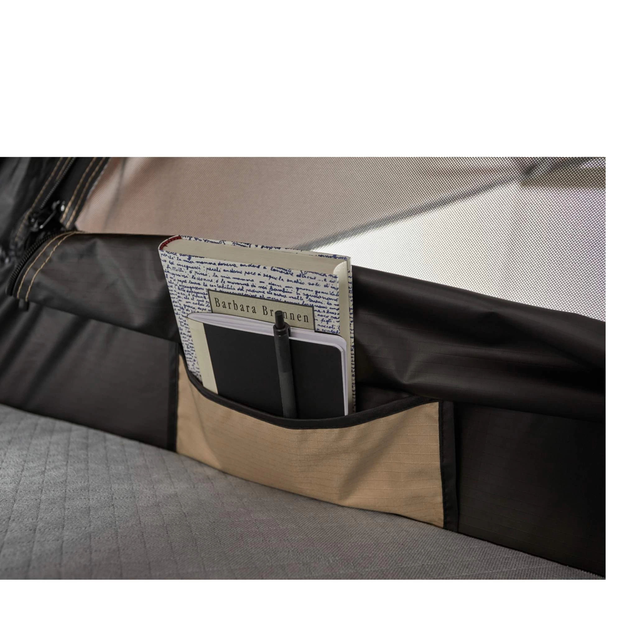 Das Dachzelt bietet dir darüber hinaus aber noch weitere praktische und nützliche Details! So sind die großflächigen seitlichen Fenster überspannt, damit du auch bei Regen und Wind für optimale Belüftung sorgen kannst und Kondenswasser morgens schnell aus dem Zelt bekommst. Im Eingang ist außerdem eine geräumige Aufbewahrungstasche für Schuhe vorhanden. Dank derer brauchst du dir keine Gedanken machen, bei schlechtem Wetter Dreck auf der Matratze zu verteilen. Eine stufenlos dimmbare 12 Watt LED-Beleuchtung sorgt dafür, dass du dich auch nach dem Sonnenuntergang noch ganz gemütlich mit einem Buch in deinen Schlafsack kuscheln kannst.