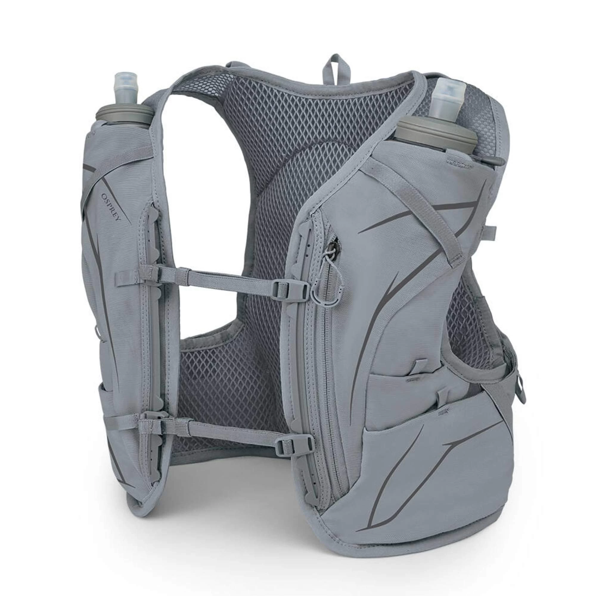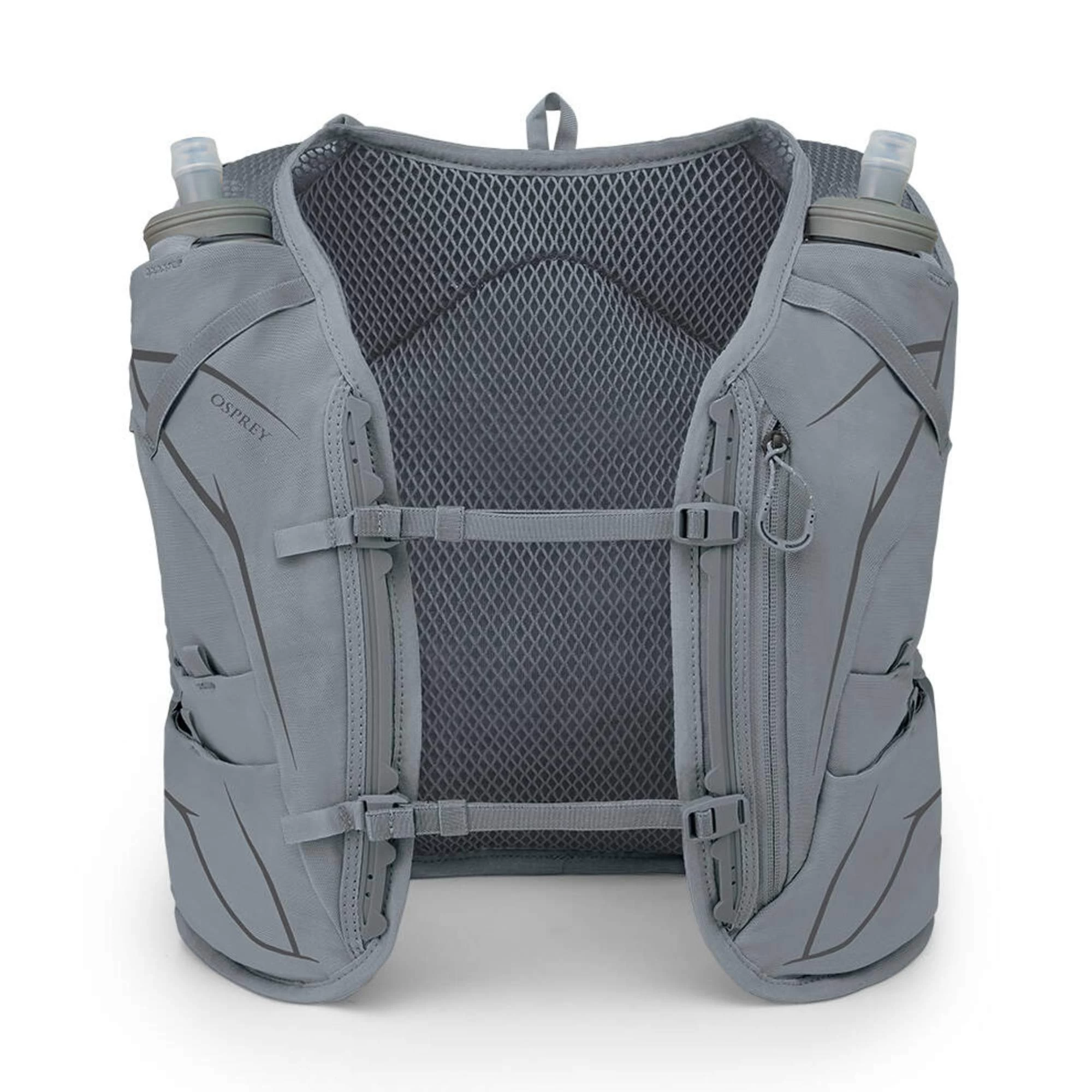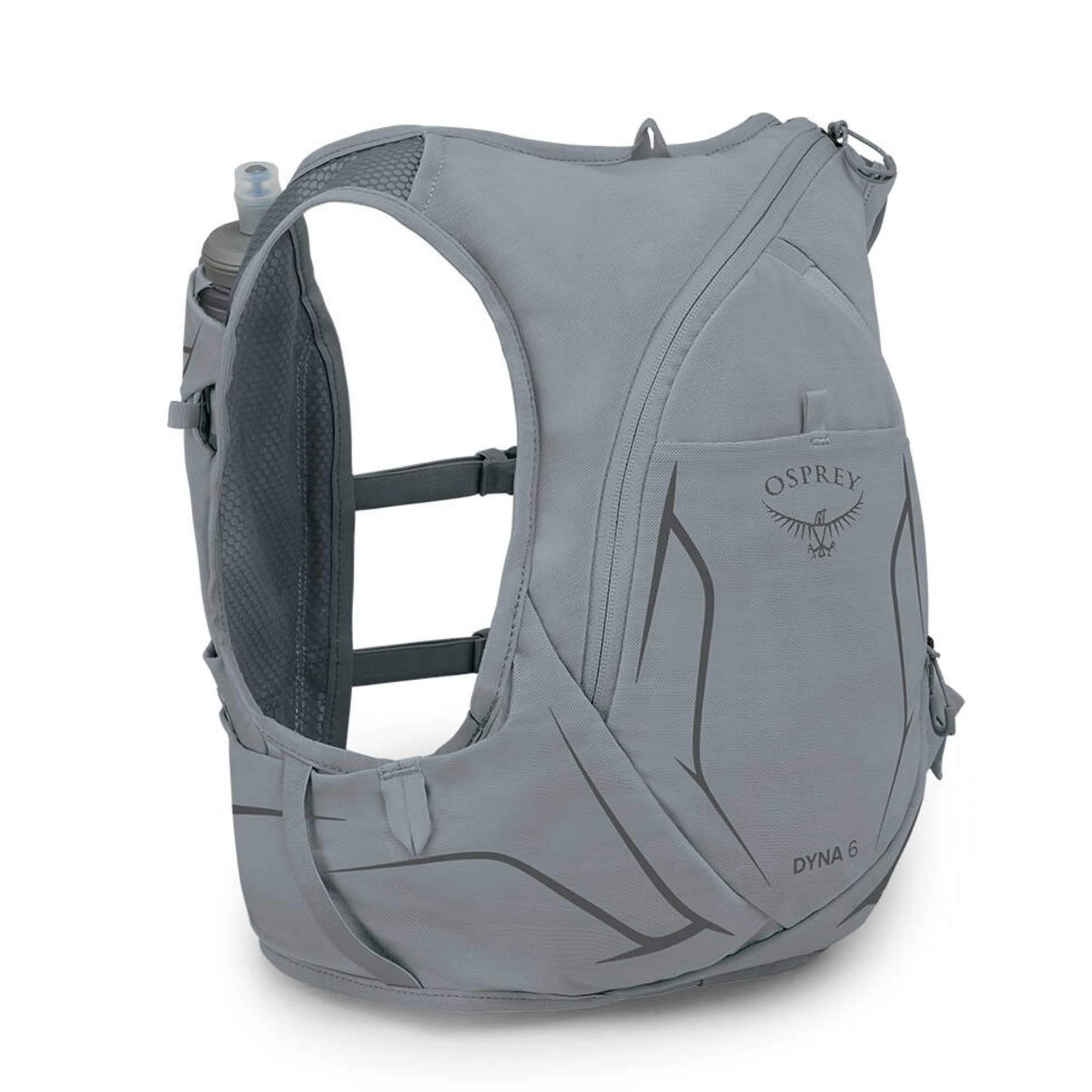 Bei der Dyna 6 liegen direkt zwei 500 ml Hydraulics Soft Flasks von Osprey bei. Die flexiblen Trinkflaschen passen perfekt in die beiden Flaschenhalter auf der Brust und stören durch ihre weiche Form nicht beim Laufen. Du kannst die Dyna auch zusammen mit einer klassischen Trinkblase nutzen, wenn du mehr als 1 Liter Flüssigkeit benötigst.
