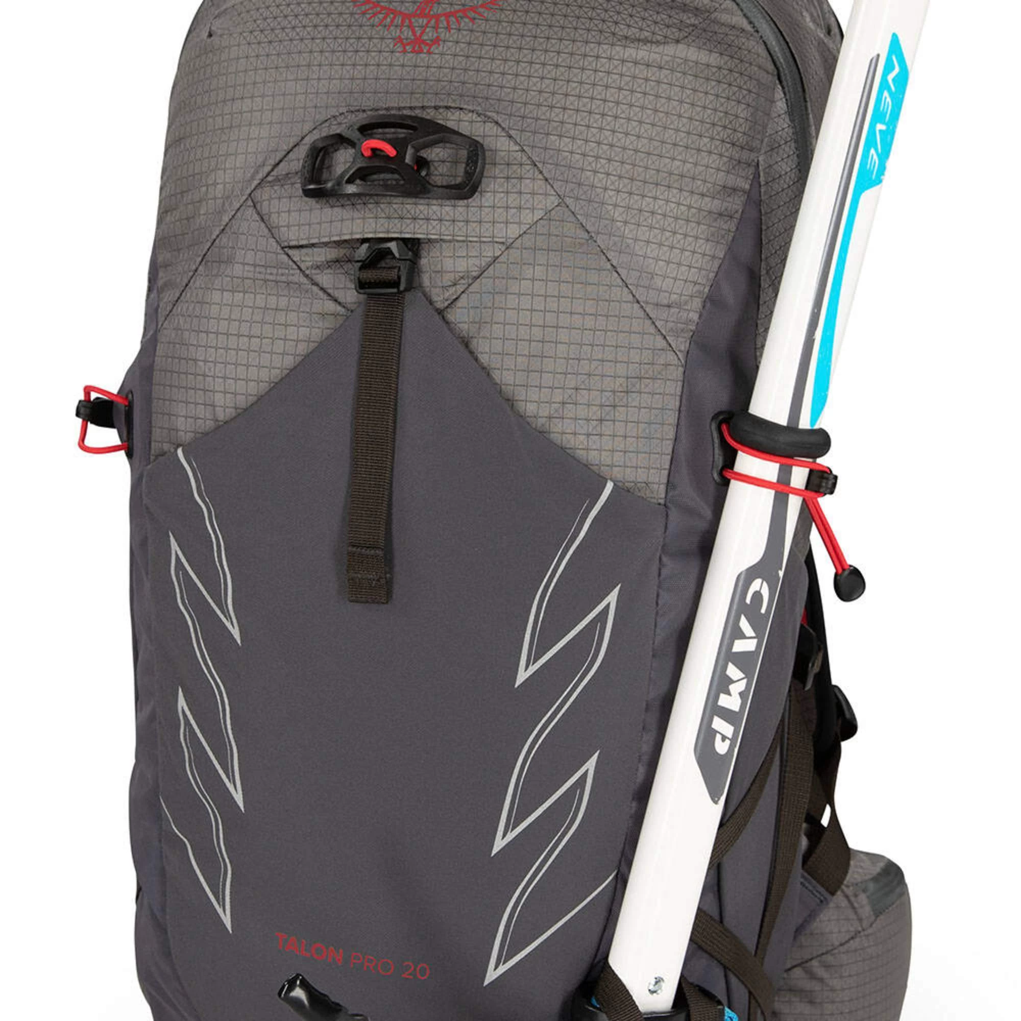 Die Helmhalterung, Eisaxtschlaufen und Trekkingstockbefestigungen machen den Talon Pro zum technischen Allrounder für Bergtouren, anspruchsvolle Wanderungen und Radtouren. Damit du unterwegs deine Trinkblase unkompliziert auffüllen kannst, ist das Trinksystemfach extern hinter der Rückenplatte angebracht. Am Schultergurt befinden sich elastische Netzfächer und am Hüftgurt zwei RV-Fächer. Hier kannst du wichtige Ausrüstungsteile wie GPS-Gerät, Smartphone, Schlauchtuch oder Snacks verstauen.