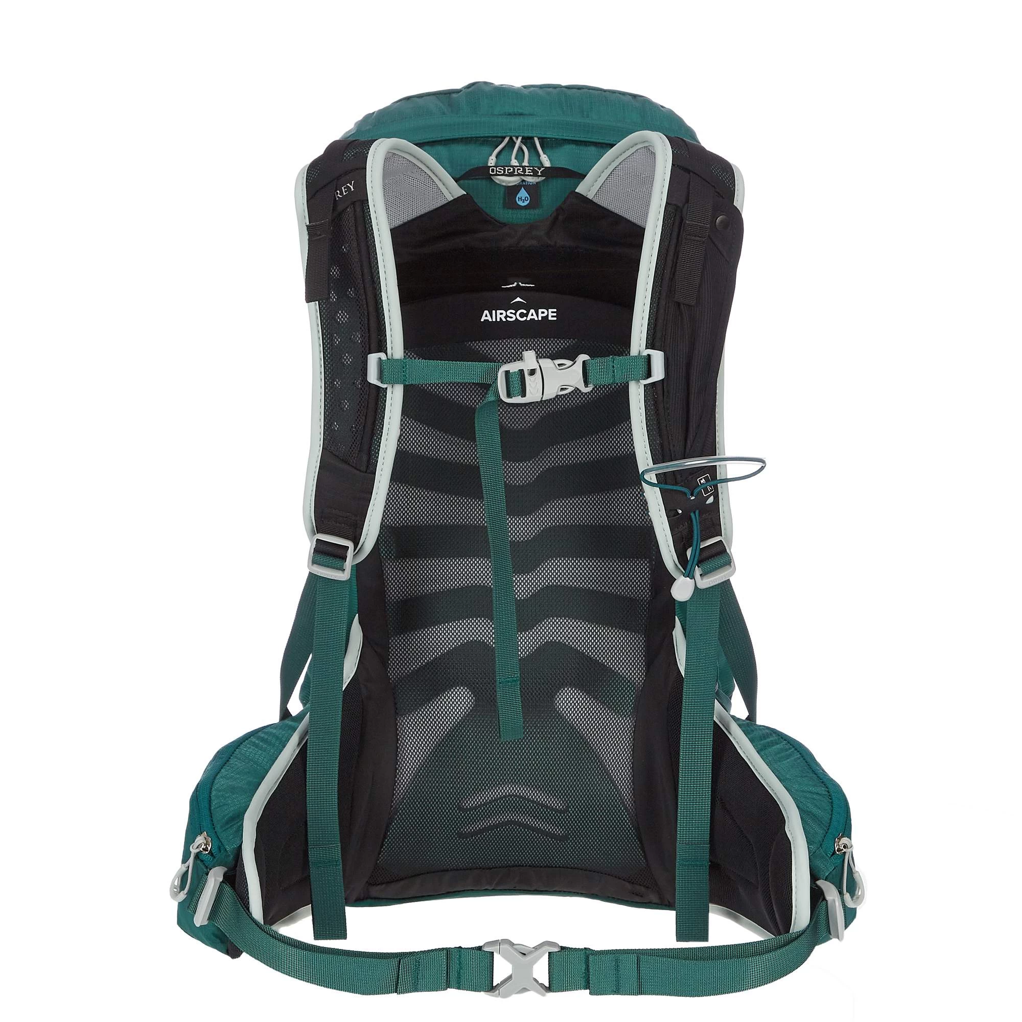 Die Talon/Tempest-Reihe wurde von Osprey mit dem modernen AirScape-Rückensystem ausgestattet. Die feste HDPE-Rückenplatte ist spritzgegossen und bleibt auch bei hoher Traglast verwindungssteif. Dabei passt sich das Material immer noch dem Rücken an. Der Meshbezug sorgt für eine sehr gute Belüftung des Rückens.