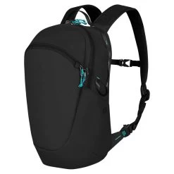 Die Gurte und der Stoff des Rucksacks sind schnittfest und ein RFID-Fach blockiert das ungewollte Auslesen deiner Karten. Statt dem Einsatz aufwendig abzuschließender Schlösser arbeitet Pacsafe mit einem Klemmriegel, um den Haupt-RV zu sichern. Wenn man den Mechanismus kennt, geht das Öffnen leicht. Für Fremde bedeutet es aber viel Gefummel. Und bis dahin wurden sie sicher bemerkt. Das gilt auch für die Stofflaschen, hinter denen du die Zipper der anderen Reißverschlüsse sicherst. Im Restaurant oder in der Bahn kannst du den Rucksack mit dem Karabiner des linken Schultergurts an einem unbeweglichen Gegenstand sichern.