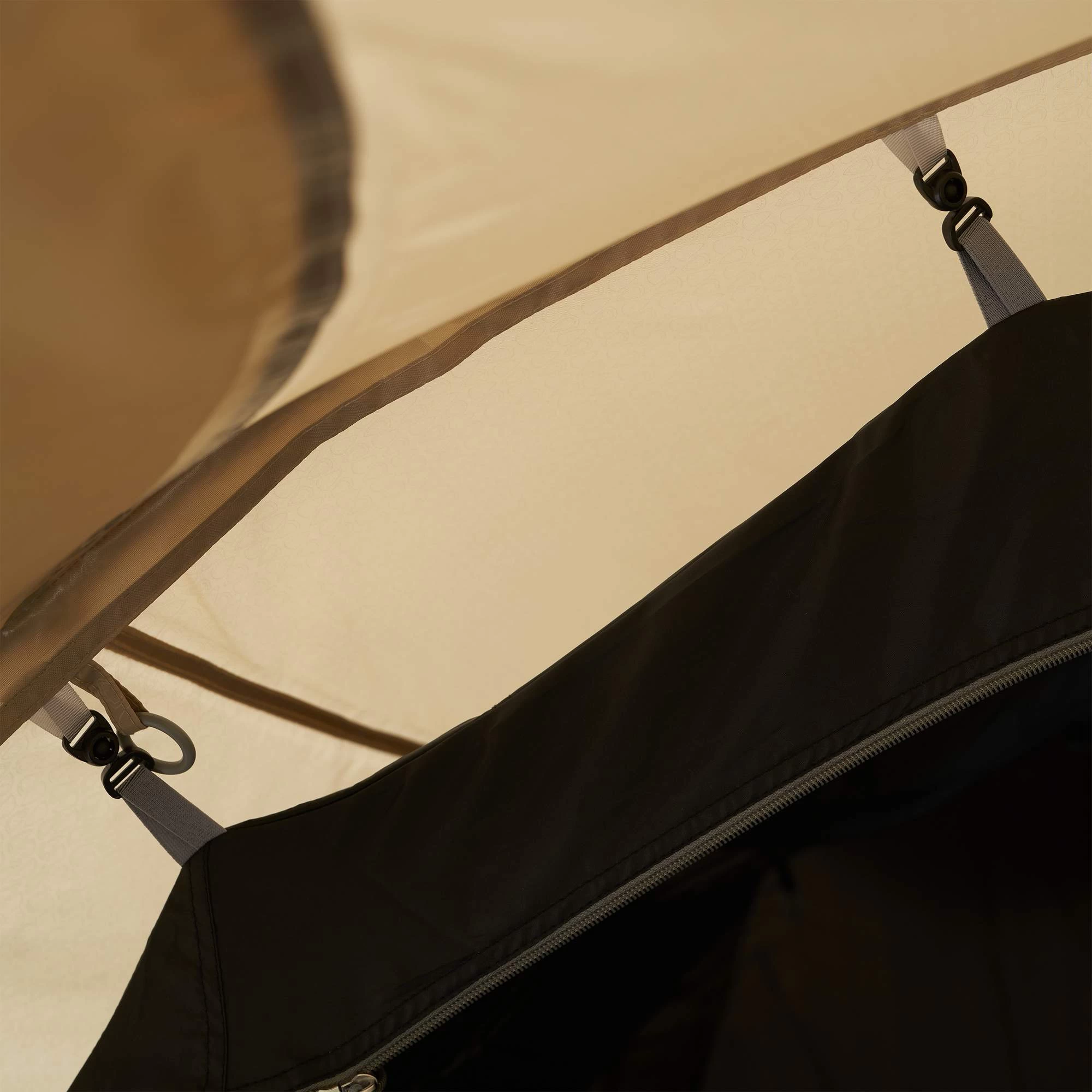 Im Innenzelt sind praktische und große Steckfächer zu finden, um Reisespiele, Stirnlampen und Sonnenschutz unterbringen zu können. Auch an den Seiten des Innenzelts sind Mesh-Steckfächer angebracht, um Schlafmaske und andere nützliche Accessoires verstauen zu können.