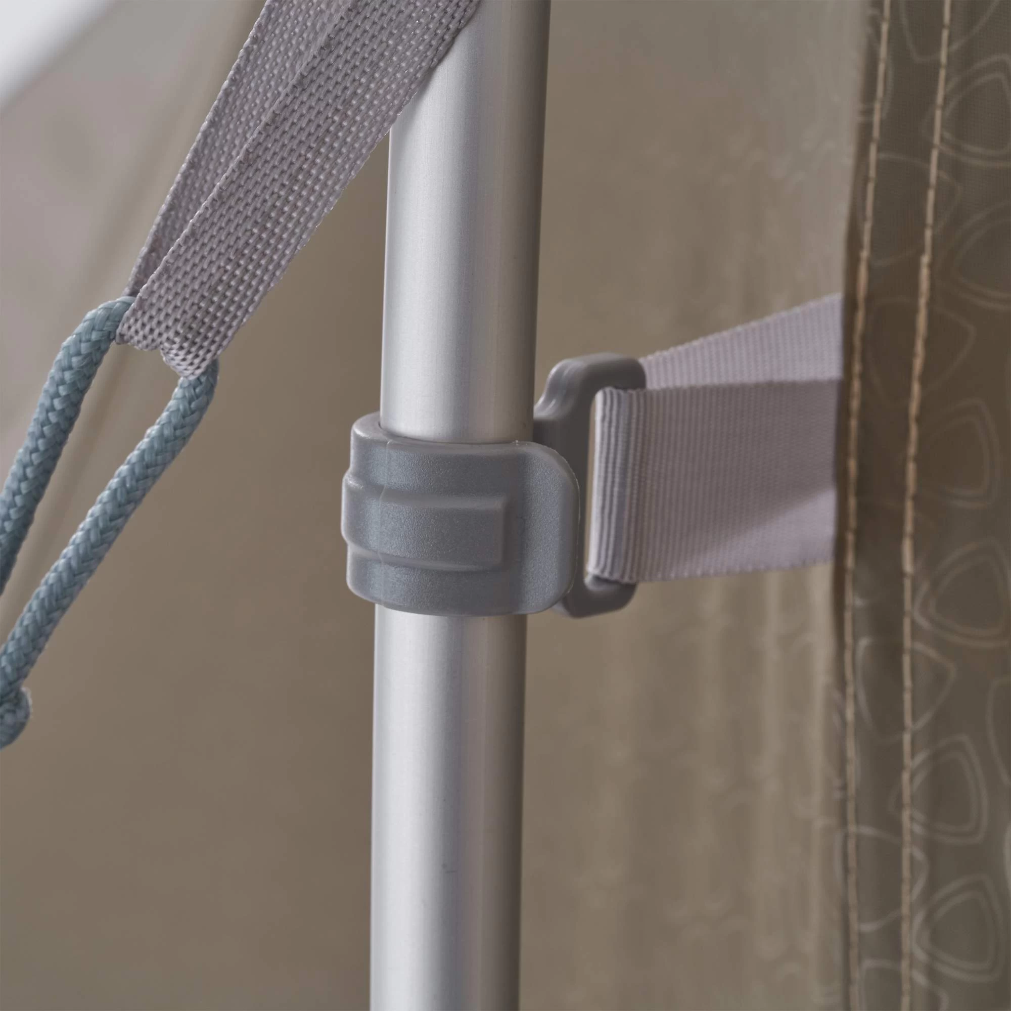 - Die Innenzelttür kann aufgerollt mit einem Knebelverschluss befestigt werden