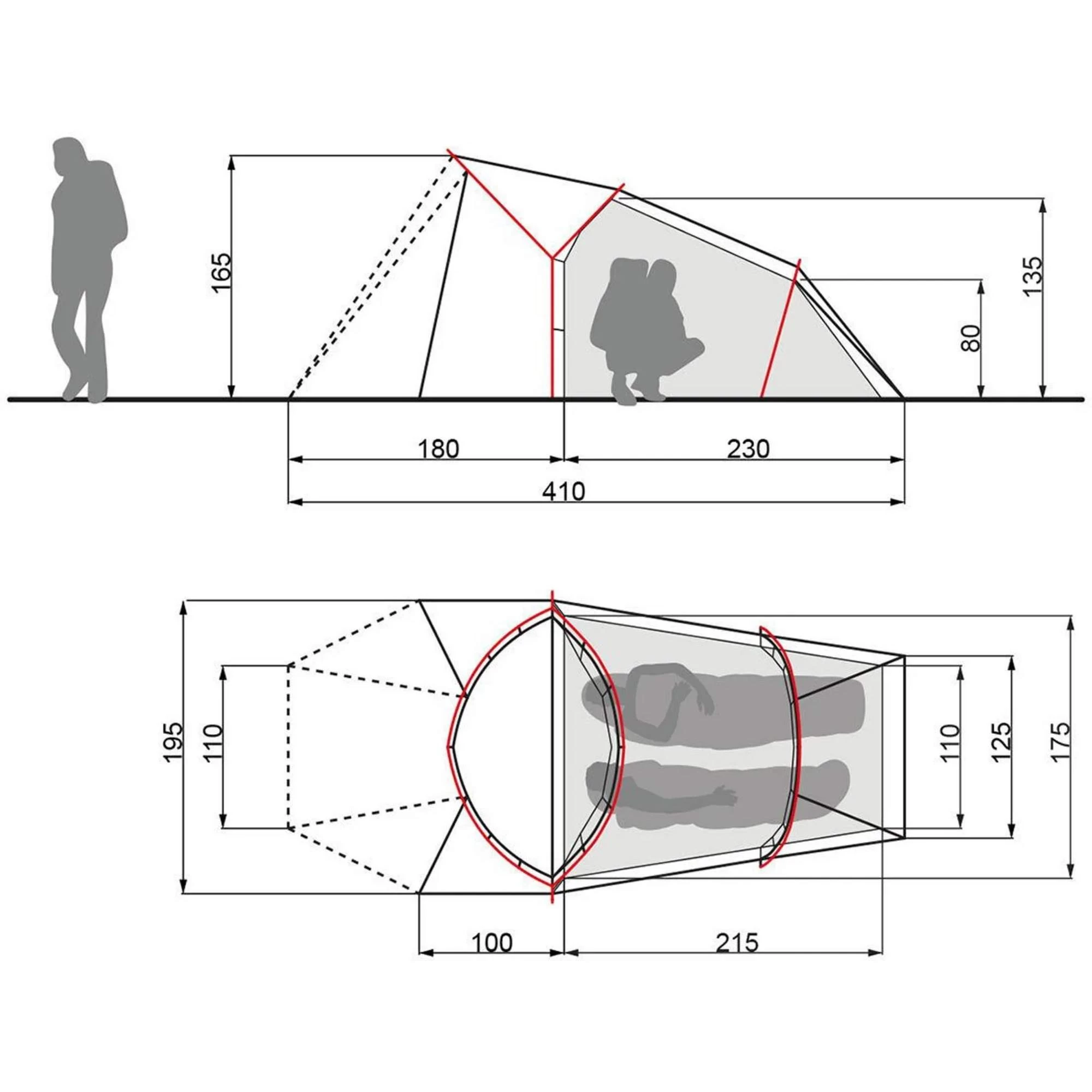 Das Innenzelt bietet im Kopfbereich 175 cm Breite, im Fußbereich läuft es auf 110 cm schmaler zusammen. Ideal also, um zwei mumienförmige Isomatten unterzubringen und noch etwas Platz für die Kleidung zu finden. Feuchte Kleidung kannst du auf der Wäscheleine im Innenzelt oder der Apsis aufhängen und über Nacht trocknen und auslüften. In den beiden Seitentaschen kannst du die Stirnlampe oder eine Brille verstauen, um sie jederzeit griffbereit in deiner Nähe zu haben.